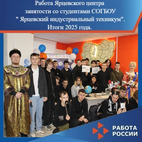 В 2025 году Ярцевский центр занятости тесно сотрудничал с СОГБПОУ «Ярцевский индустриальный техникум». В течении года проведено более 20 мероприятий, таких как профтуры, ярмарки вакансий, мастер-классы и деловые игры, в которых участвовали более 200 студентов.